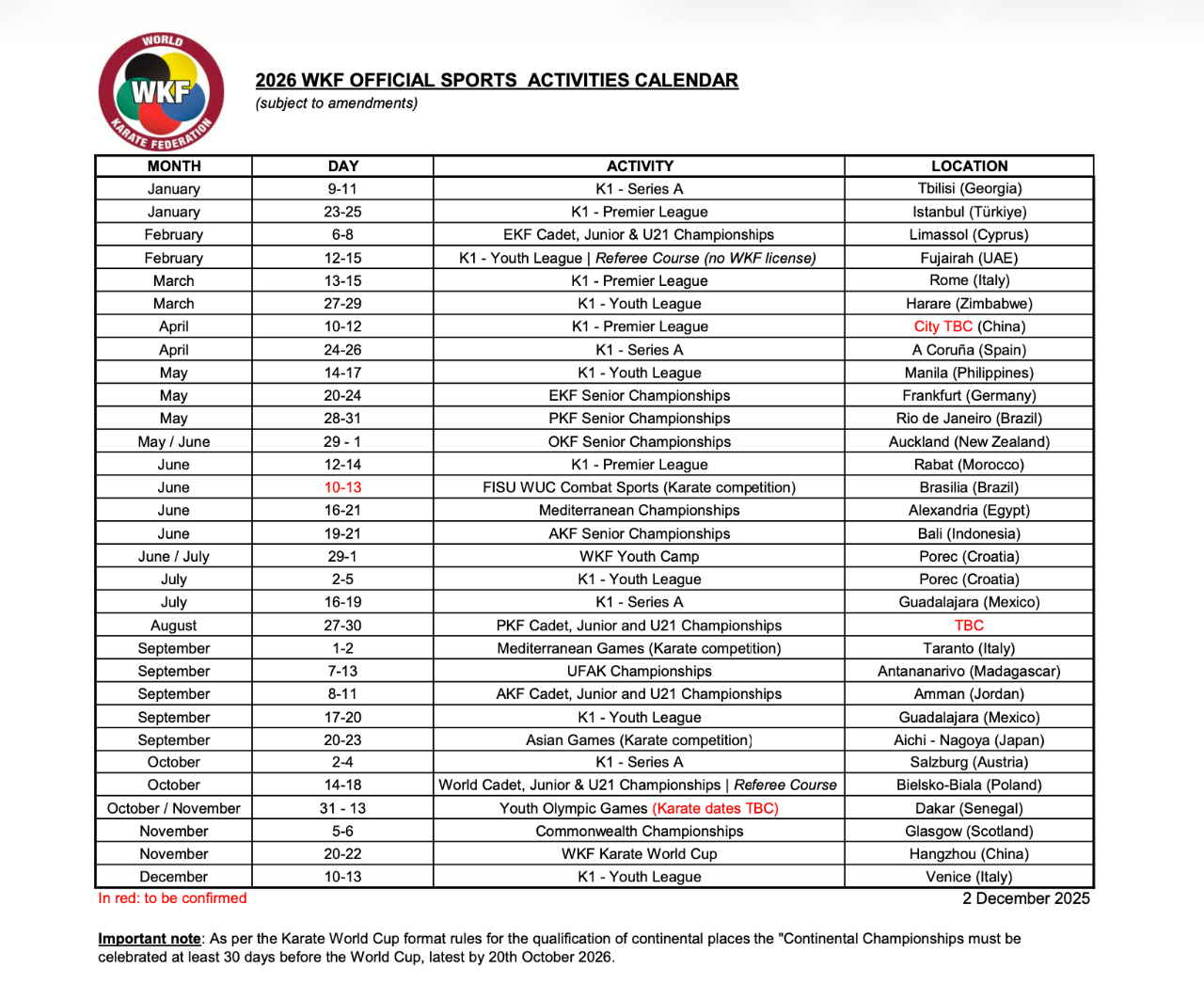 Calendario oficial WKF 2026