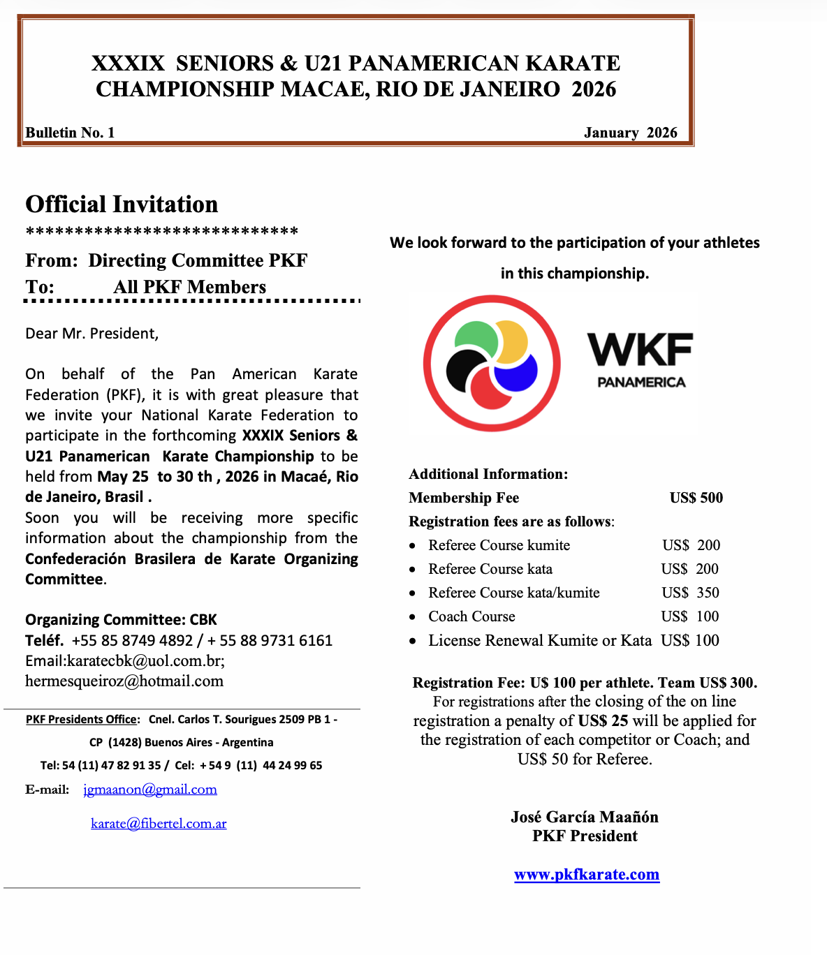 Documento here: PKF Invitation XXXIX Senior - Under 21 Pan American Karate Championship Macaé, Rio de Janeiro 2026.pdf (317700)